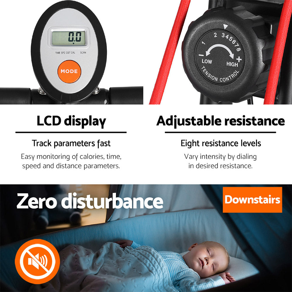 Features Tough steel X-frame Silent magnetic system 8 resistance levels LCD monitor display Extra wide comfy seat 5 adjustable seat height levels Non-slip protective feet 100kg weight capacity Comes with resistance ropes