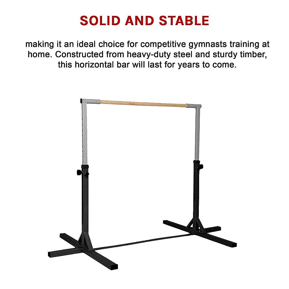 Whether your child is a serious gymnast or just wants to have fun, this kids' horizontal gymnastics bar by Randy Travis Machinery is just the ticket. Putting safety first, this training bar is solid and stable, making it an ideal choice for competitive gymnasts training at home. Constructed from heavy-duty steel and sturdy timber, this horizontal bar will last for years to come. With its four knobs, this horizontal bar is easily adjustable for kids of all ages.